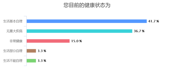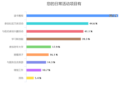大部分老年人的休闲娱乐方式主要集中于读书、看报、与街坊邻居一起活动等,社区提供的文化娱乐活动都差不多,内容形式单一,多是老年人自娱自乐,没有特别针对需求为老年人组织。走访调研结果显示60岁以上的老年人,41.7%生活基本能够自理。根据国家卫健委的调查数据显示,慢性病导致老年人死亡人数达到总死亡人数的86.6%。